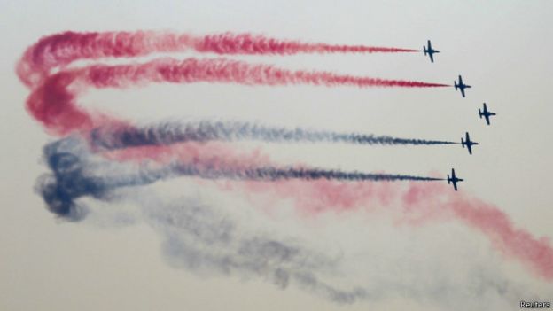 تقول الجمهورية: “القدارت العسكرية البحرية والجوية تبهر العالم… علم مصر فوق الفرقاطة ’فريم‘ والـ ’إف-16‘ تحلق في سماء القاهرة”.