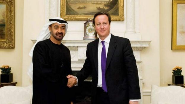وفي الوثائق التي اطلعت عليها الغارديان طلب ولي عهد أبو ظبي من كاميرون كبح جماح تغطية بي بي سي. وفي المقابل، يعرض على كاميرون صفقات نفط وسلاح تدر أرباحا بالمليارت للشركات البريطانية.