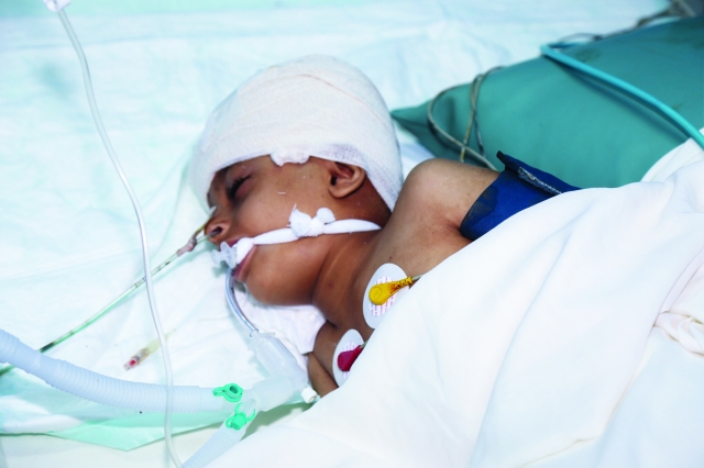 الطفل محمد صلاح ذو الـ7 سنوات يرقد في العناية المركزة بعد أن دخل في غيبوبة منذ نحو أسبوع إثر إصابته بشظايا قذيفة هاوزر في رأسه عندما استهدف الانقلابيون حي النسيرية السكني وسط المدينة بالقذائف.