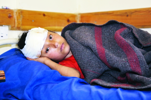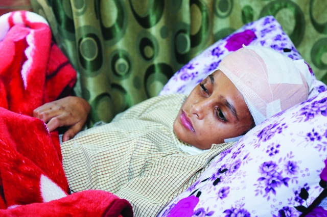الطفل وسيم محمد احمد (12 سنة) اصيب بشظايا صاروخ كاتيوشا في رأسه أثناء خروجه من منزلهم لتعبئة مياه شرب في حي الروضة، وبقي في غيوبة بالعناية المركزة 20 يوما قبل ان يتم اخراجه امس الى قسم المراقبة .