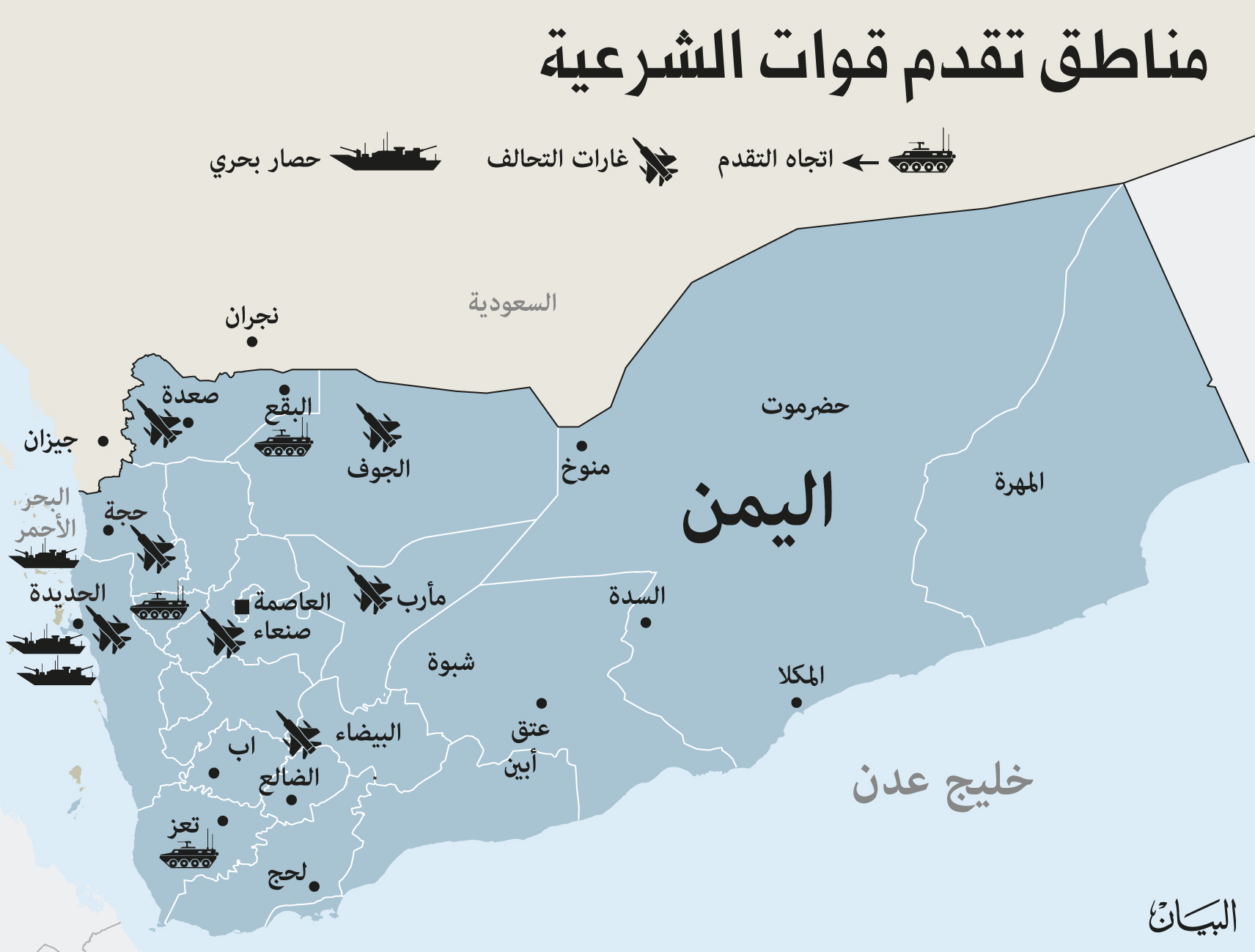 وقالت مصادر عسكرية لـ«البيان» إن الجيش تمكن من السيطرة على مجمع حفصة والمقضة، ومنزل قيادي موالي للحوثيين إضافة إلى رأس النقيل. وأضافت أن المواجهات لاتزال مستمرة على مداخل منطقة «المخعف» بين القوات الموالية للشرعية وميليشيا الحوثي وصالح، المتمركزة في مدرسة طارق بن زياد.