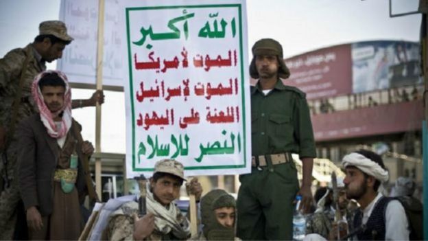 ويسيطر الحوثيون على كل من العاصمة صنعاء وريدة. والشعار الذي ترفعه الحركة الحوثية هو “الله اكبر. الموت لأمريكا. الموت لإسرائيل. اللعنة على اليهود .النصر للإسلام”.